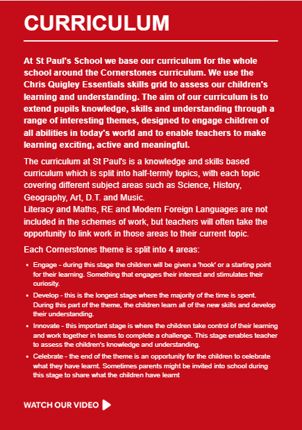 At St Paul's School we base our curriculum for the whole school around the Cornerstones curriculum. We use the Chris Quigley Essentials skills grid to assess our children's learning and understanding. The aim of our curriculum is to extend pupils knowledge, skills and understanding through a range of interesting themes, designed to engage children of all abilities in today's world and to enable teachers to make learning exciting, active and meaningful.